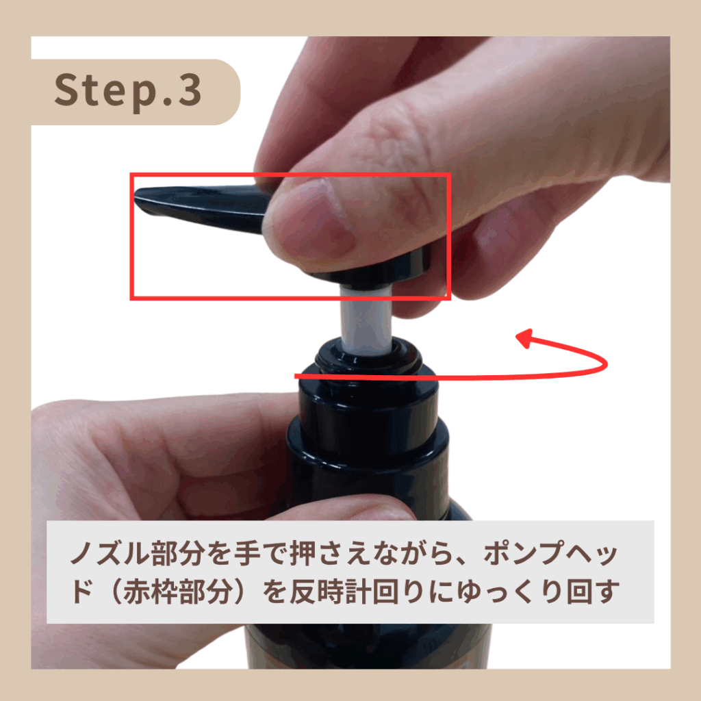ノズル部分を押さえたまま、もう一方の手でポンプヘッド(赤枠部分)を反時計回りにゆっくり回してください。